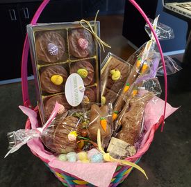 A solid Easter Bunny, jelly bean bag, pretzel rod pair, small Peep-a-Boo egg, Oreo 3 box, Graham cracker pair, Non-pareils and a small Filled egg, all wrapped up in our bright baskets with cellophane and ribbon!