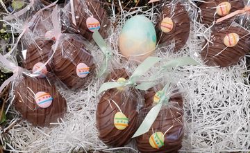 Solid chocolate half-egg wrapped in pretty pastel foil, the size of a hen's egg.