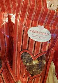 Large solid chocolate letters spelling it out across in a clear bag. Also available in a box with a clear lid, $11.00.