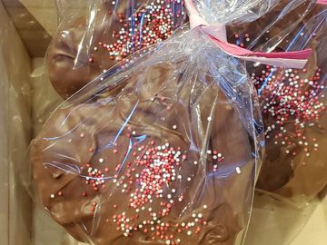Large, heart-shaped Rice Krispie treats dipped in chocolate & decorated with colorful non-pareils.