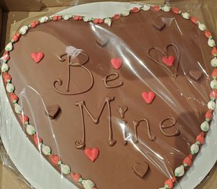 Whole heart-shaped chocolate pizza that says, "Be Mine!" packed in a 12" pizza box.